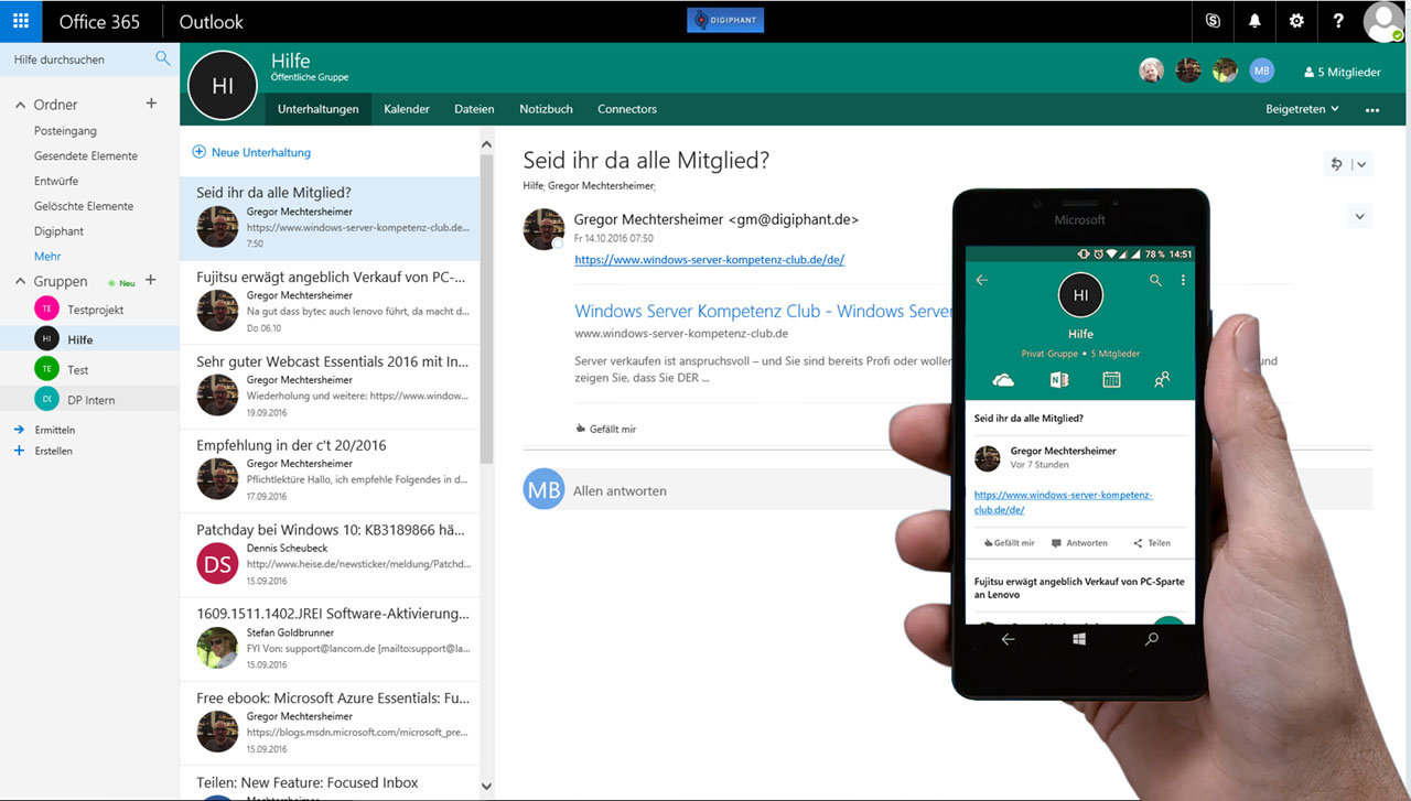 - Jede Gruppe erhält eine E-mail-Adresse und Unterhaltungen können entweder durch eine E-Mail an die Gruppe oder direkt als „Konversation“ in Outlook oder über die Gruppen-App geführt werden. Unterhaltungen werden damit an einem zentralen Ort gespeichert, aber Mitglieder erhalten die Nachrichten zusätzlich über ihr Postfach.
