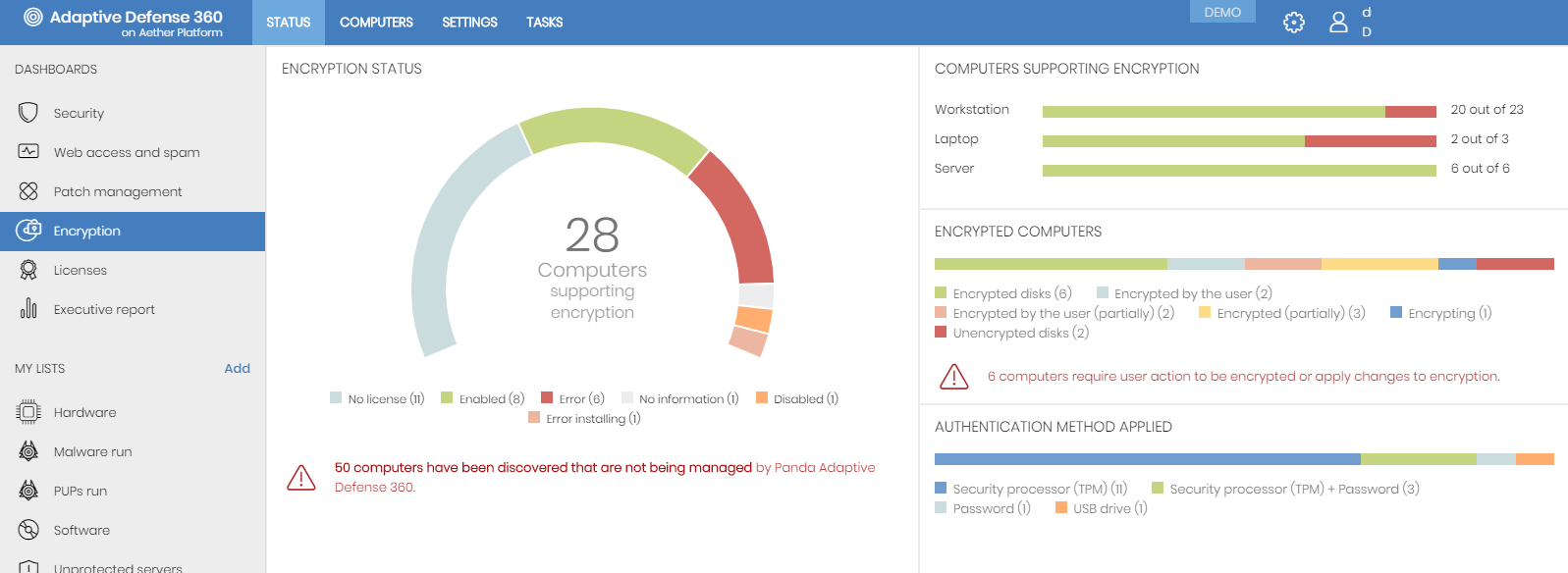Panda Full Encryption setzt BitLocker ein, um die Laufwerke Ihrer Windows-Laptops, Desktops und Server vollständig zu verschlüsseln. Das Panda Full Encryption Dashboard bietet einen globalen Überblick über alle kompatiblen Netzwerk-Endpunkte und zeigt den Verschlüsselungsstatus und die verwendete Authentifizierungsmethode. Es ermöglicht Administratoren zentralisiert und bequem Verschlüsselungseinstellungen zuzuweisen und Verschlüsselungsberechtigungen einzuschränken.